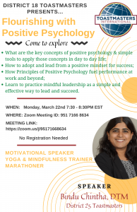 March 22, 2021 | District 18 Toastmasters Presented an education session titled The Science of Flourishing as part of the Mastery Mondays workshop series hosted