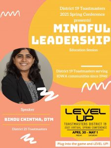 May 1, 2021 | D19 Toastmasters Delivered an education session titled Mindful Leadership for Elevated Performance at the Spring Conference “Level Up!!” hosted by Toastmasters