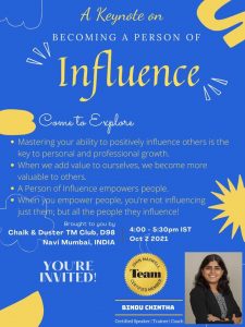 October 2, 2021 | Vashi, Navi Mumbai, India Invited as a guest speaker to deliver an education session titled Becoming a Person of Influence at